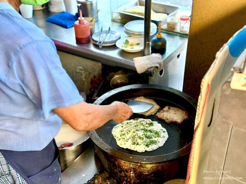 阿公熟練的舀了一匙粉漿到鍋裡煎,再撒上已切好的蔥花韭菜一起煎,手工現煎的古早味蛋餅非常迷人。