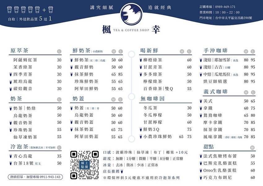楓幸咖啡茶飲專賣店不只有好喝的單茶,糖糖也非常推薦抹茶鮮奶,奶蓋系列及拿鐵咖啡,尤其是在外面手搖飲比較少見的拿鐵咖啡,嚴選自家烘焙咖啡豆,搭配小農鮮奶,好喝又順口,現在不管是自取還是外送,皆有買五送一的活動,另外只要是太平區,滿150元即可免費外送唷~