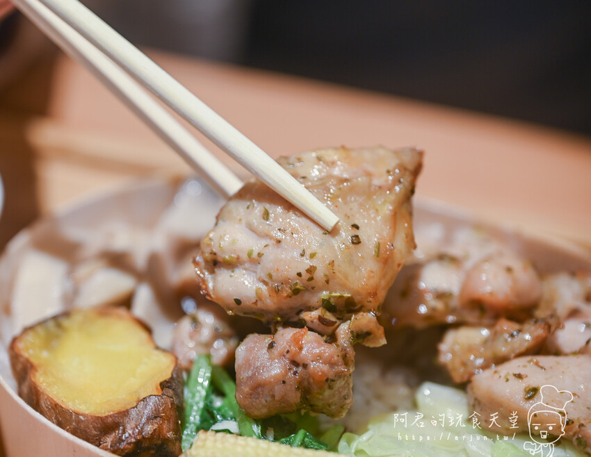 除了主餐外,配菜也是不馬虎喔~有玉米筍、高麗菜、油菜、袖珍菇跟地瓜,菜量十足,相當有誠意。