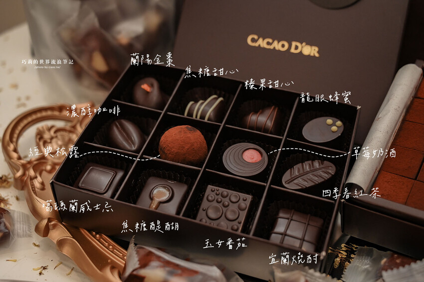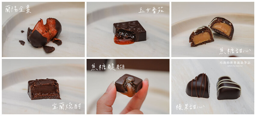 其中我最喜歡蘭陽金棗、焦糖醍醐、焦糖甜心、龍眼蜂蜜、噶瑪蘭威士忌,法國頂級巧克力與柔軟的內餡共譜的味蕾舞曲,讓我整個人都融化在巧克力裡了~