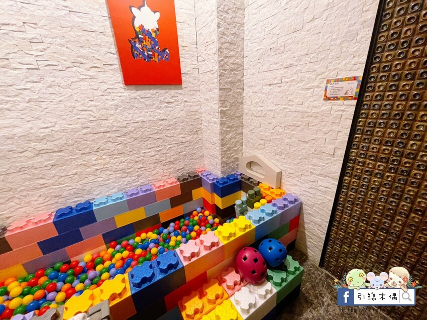 裝置遊樂設備不只大積木牆,浴室裡還有一個軟積木球池,感官體驗玩耍超開心。