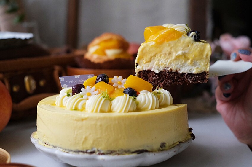 蛋糕體表面有著淡淡的焦糖香不明顯、因為都被甜香的芒果給淹蓋過了XD 入嘴濕潤中又帶點綿密以及入口即化的口感,嘴巴內充斥著淡淡的芒果乳酪香氣,甜香的芒果跟著入嘴,享受層次明顯的幸福沁動,就在這一瞬間!!!