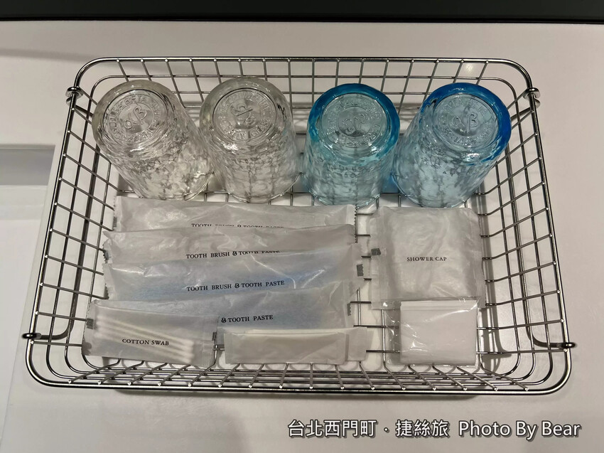 放有水杯、快煮壼和毛(浴)巾等備品,洗手台下方還有一台小冰箱