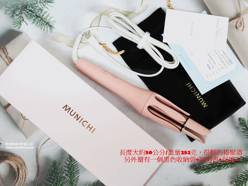 可以從紙盒裡面拿出MUNICHI 沐尼黑/水潤負離子溫控捲髮器MR.Curler – 粉藕橘顏色,長度大約30公分/重量252克,很輕的捲髮器,另外還有一個黑色收納袋+說明書+保證卡。