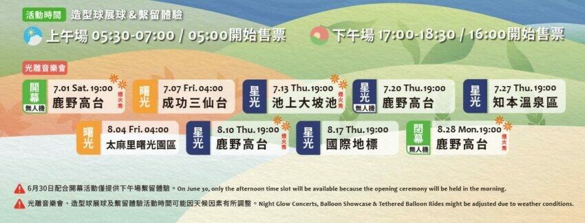 熱氣球繫留搭乘的開放時段,上午場為05:30~7:30,下午場為17:00~19:00