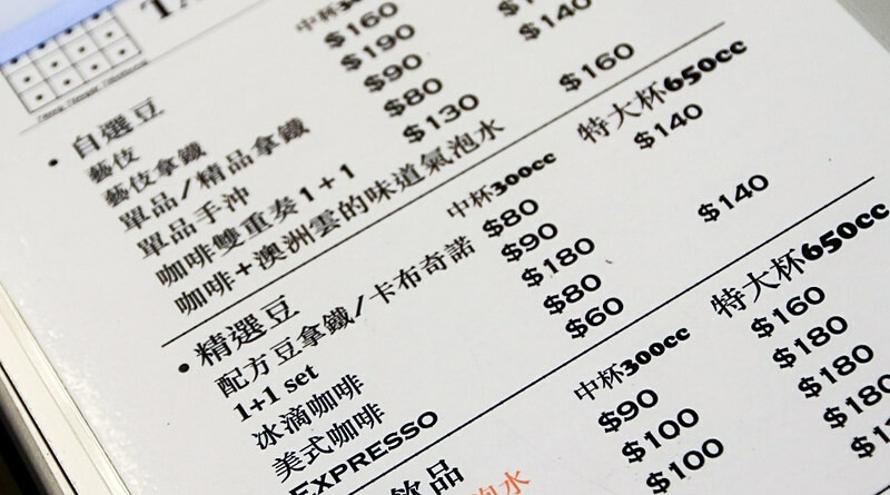 一般的拿鐵是80、1+1也才90,美式80,濃縮更只要60,手沖也都100元不到,任何咖啡豆都可以做成拿鐵,藝伎單品160大概是我見過最低的了..拿鐵則是190在這算是很高價元的。