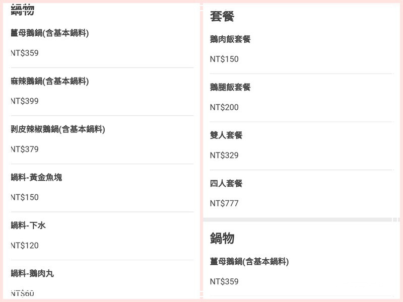 而且竟然還有鍋物XD,別人都是薑母鴨,中壢阿城是薑母鵝😂😂,說真的我冬天會想來嚐嚐耶!