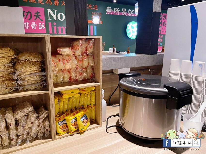 副餐區的種類也很齊全,除了基本白飯外,王子麵、鍋燒關廟麵、冬粉、意麵,都可以無限量吃到飽。狂一鍋的湯頭美味,麵食吸附湯汁精華,又是一番Q彈享受。