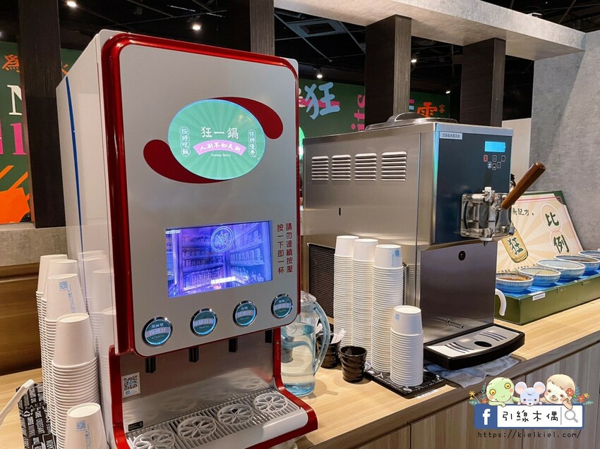 狂一鍋的自助吧非常精彩,位於兩區座位中間鄰近入口處,兩側往來動線流暢。醬料、飲料、附餐還有冰淇淋都無限吃到飽,最狂的是別家火鍋提供「菜盤」,狂一鍋直接給你滿滿滿的「蔬菜吧」任你挾,兩大櫃滿滿蔬菜火鍋料狂狂吃好又吃飽!