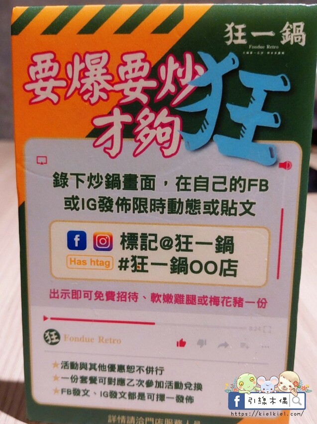 優惠活動別錯過,「要爆要炒才夠狂」,只要錄下炒鍋畫面,FB、IG貼文或限時動態擇一標記@狂一鍋 #狂一鍋○○店,即招待梅花豬or軟嫩雞腿一份。