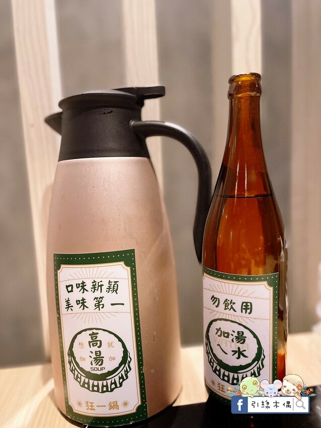 因為狂一鍋湯底都十分濃郁,所以每桌都備有水及高湯,不需要特別起身拿取。風情十足以米酒瓶盛裝的是開水,是用來稀釋越煮會越鹹口的湯頭,可不是暢飲米酒哦~另一壺則是高湯,可以自由調配喜歡的濃淡滋味。