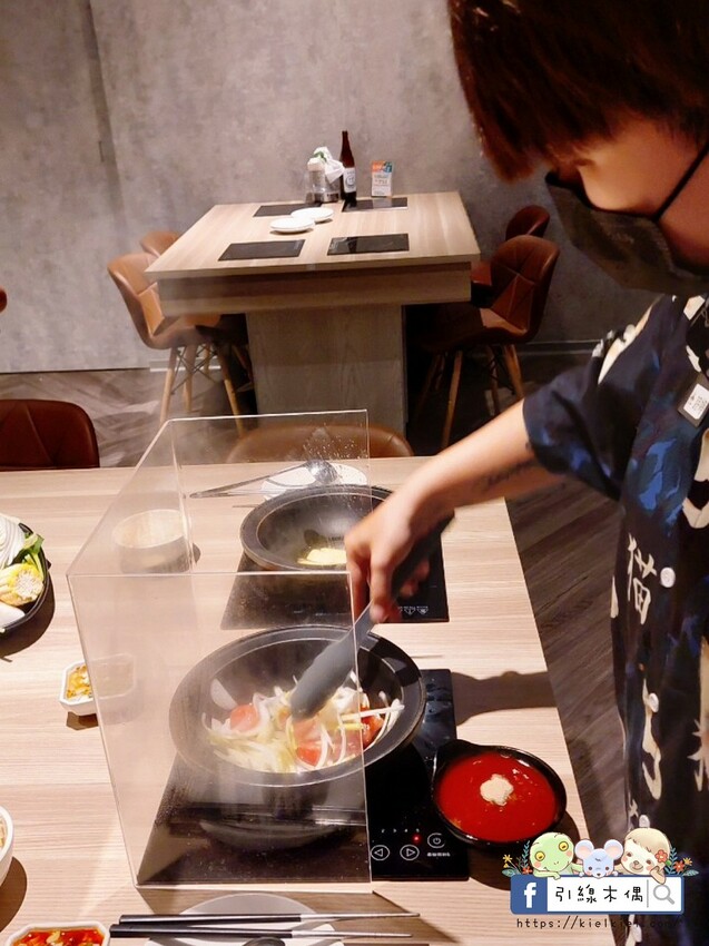 店員在鍋物外圈圍ㄇ型隔板防油噴濺,備好相關佐料,將新鮮蕃茄、蒜苗與芹菜翻炒,直到蕃茄出水,加入白胡椒等獨家特調肉醬,爆炒出濃郁撲鼻香,彷彿蕃茄義大利麵變身火鍋,最後再倒入高湯燉熬數分鐘。