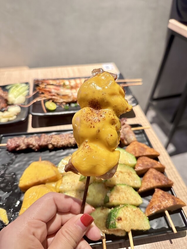 烤雞腿串的外皮經過烤煮後會變得香脆,雞肉則肉質嫩滑多汁。吃到口中時,能夠感受到烤肉的豐潤香氣和鮮美口感,搭配起司是女兒指定