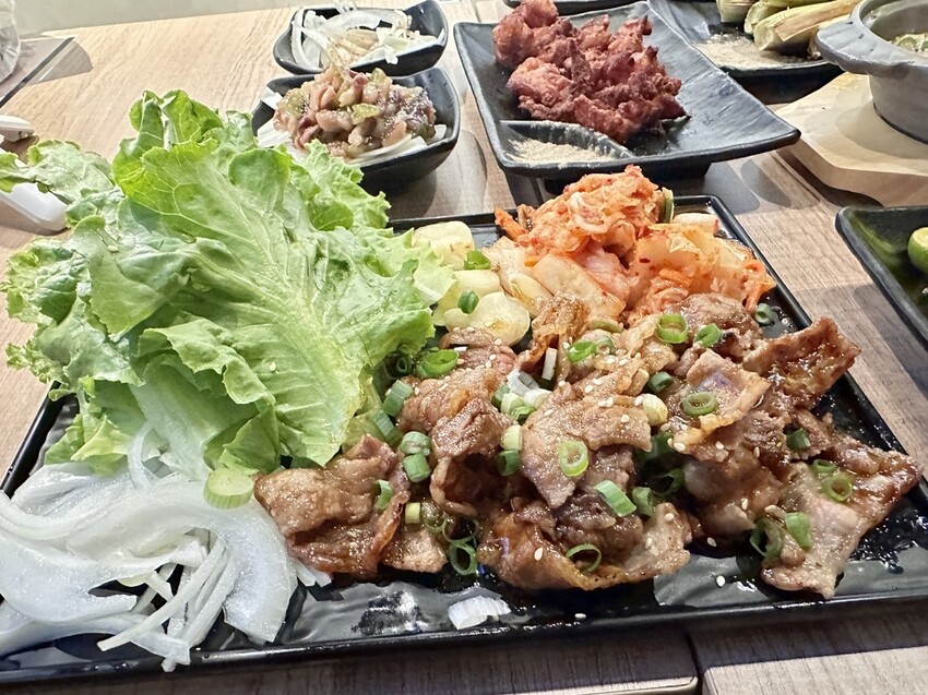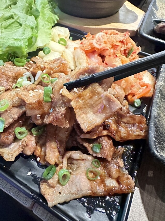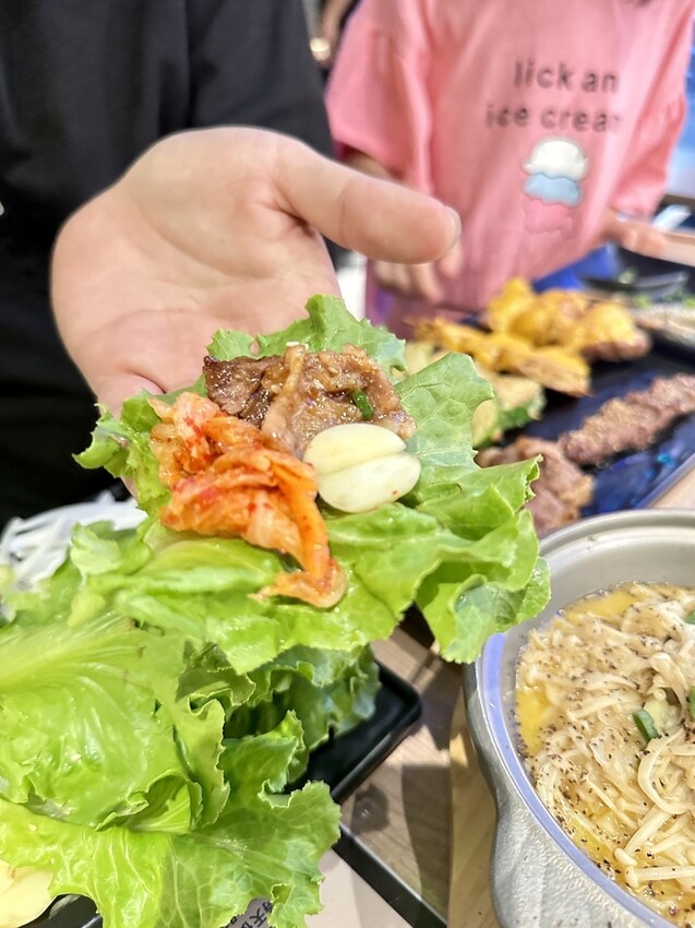 頗像韓式燒肉包菜,嫩滑的肉片,搭配醬料、蒜泥、辣椒醬等調味料進行烤煮,使得烤肉帶有鮮美的香氣和多層次的風味,然後拿起生菜依照個人口味加入自已喜歡的配料,像我是喜歡加上泡菜跟大蒜加燒肉片一口吃下,口感豐富又很有一種韓劇的感覺