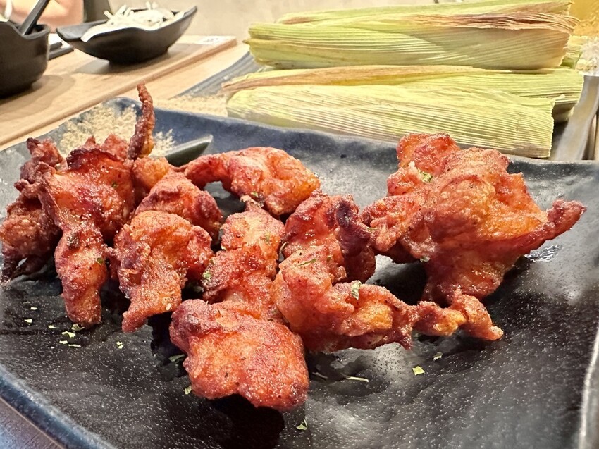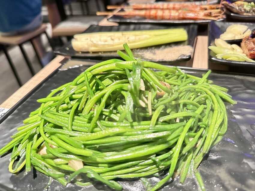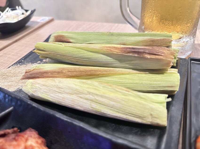 連外殼一起串烤的玉米筍,保留了玉米的香甜,打開外殼後還有其香甜的汁液,單吃青脆或搭配胡椒塩食用增加其口味都很美味