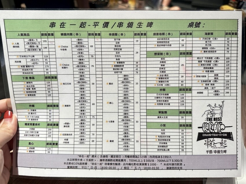串在一起是一家平價的串燒居酒屋,新開幕的士林店環境整潔乾淨,而且交通方便,距離捷運站步行約10~15分鐘的腳程,店內料理種類也相當多種,生蠔海鮮啤酒,還有各式串燒炸物,數十種料理讓你選擇,絕對會有你喜歡的,串在一起士林店,在店面座位設計上還有包廂跟可愛的露營風用餐區,可以包場以外,提供了一種輕鬆愉快的用餐環境,讓客人可以享受美味的串燒料理同時品嚐各式各樣的小吃和酒類