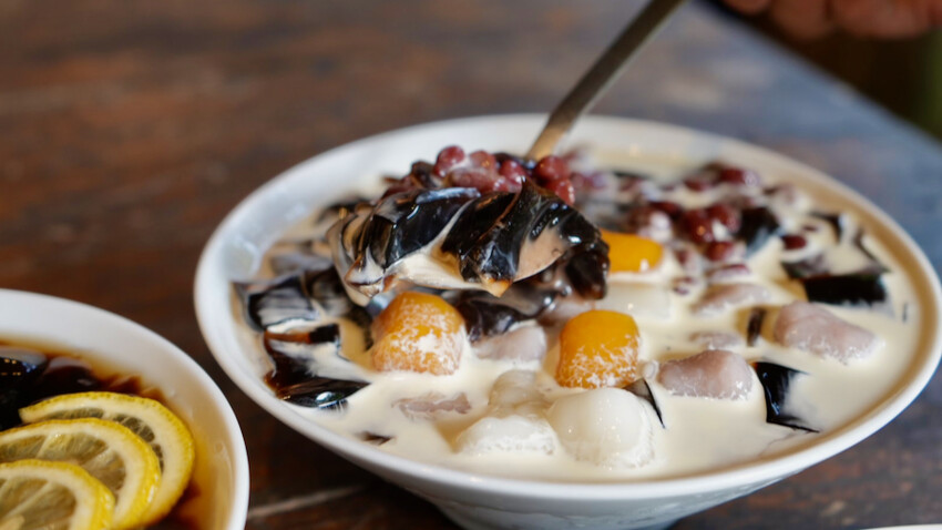 招牌芋圓仙草凍裡面有滿滿的仙草凍,還有芋圓、地瓜圓、紅豆,再淋上奶球,搭配出最樸實又美味的吃法,重點是「俗擱大碗」,這碗超大只要70元。