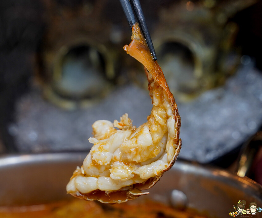 龍蝦都貼心切好,熬煮全熟就可以挖出龍蝦肉大口吃