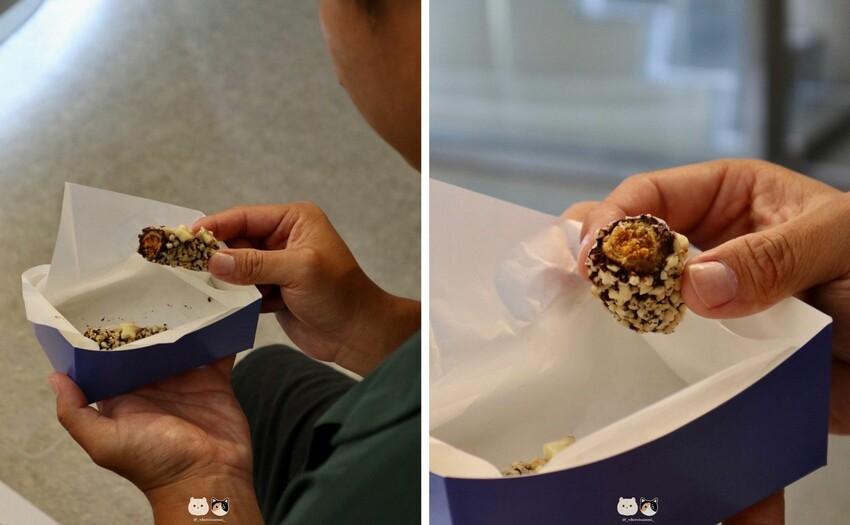 花生的香氣在咬入口中後完美釋放,花生醬細緻的絲滑感,配上白巧克力更為濃郁,但相對的更容易感到甜膩,這時候喝一口咖啡真的完美中和了膩味~我個人很喜歡花生口味,細細咀嚼更能感受花生香氣