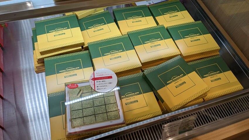 在多款商品中特別推薦抹茶與起司口味的生巧克力,融合了京都和北海道的元素,共有兩層。上層是混合宇治抹茶的巧克力,下層是使用北海道產的三種起司(馬斯卡彭、高達和奶油起司)製作的白巧克力。表面灑上宇治抹茶巧克力粉使味道更加深邃,抹茶的風味會在口中擴散,與甜美的起司完美結合。