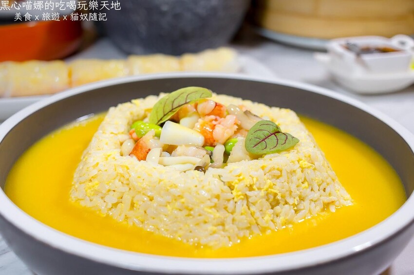 亮黃羹湯是以紅蘿蔔、全雞、雞腳…等食材熬煮六個小時製成,所以喝起來非常鮮美甘甜,炒飯堆砌成六角珠寶盒,藏進滿滿鮮蝦、干貝、花枝和魚肉塊,一端上桌令人眼睛為之一亮!