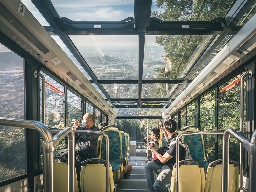 從山麓站到山上站需要搭乘纜車,其纜車與我們印象中吊在半空中的纜車完全不一樣,是在地面上運行的,連纜車本身造型也很特殊,四邊及車頂皆為透明玻璃且一搭上就很有〝傾斜感〞!