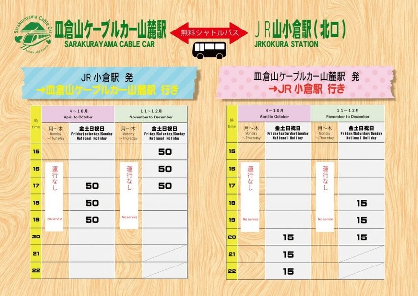接駁車為小巴士,搭車地點讓我在北口一度找到幾乎要放棄了,沒想到時間越來越逼近時,看見原本是排門司港接駁車的停車格上,停了一台小巴士,抬頭看一下牌子寫著『皿倉山ケーブルカー山麓駅』,眼淚都快流下來了!因為搭車處的周遭並沒有如官網所說的有放置有關皿倉山的看板啊!還有,小倉的接駁車時間一小時只有一班,雖然當時從小倉搭乘的人寥寥無幾,但畢竟才開辦不久(2023/4月至今)。2025年年中,收到網友回饋,小倉北口往皿倉山纜車山麓站的接駁已停駛,煩請旅客門前往八幡站搭乘接駁車。