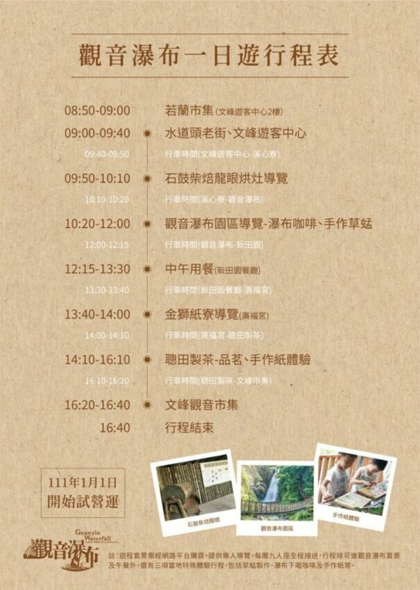 當時試營運期間一共推出了三種遊程,分成一日遊、半日遊 (上午) 、半日遊 (下午),除了欣賞觀音瀑布美景、提供接駁車來回、專人導覽,每個遊程都有不同的亮點,像是能在瀑布之下品茗或喝咖啡,或是造訪舊紙寮、體驗手作紙、石鼓柴焙龍眼烘灶導覽,讓遊客藉機深入周邊聚落,讓遊程更加精采!