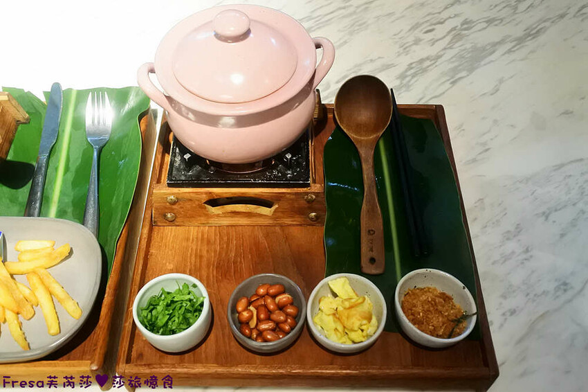 粉色鍋盅也很有特色,選用木製大杓.