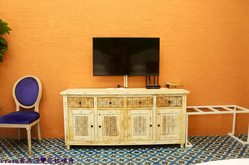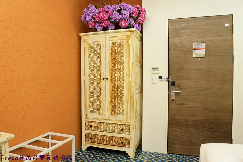 打開房門,立刻看到很有異國風情的呂色牆面.