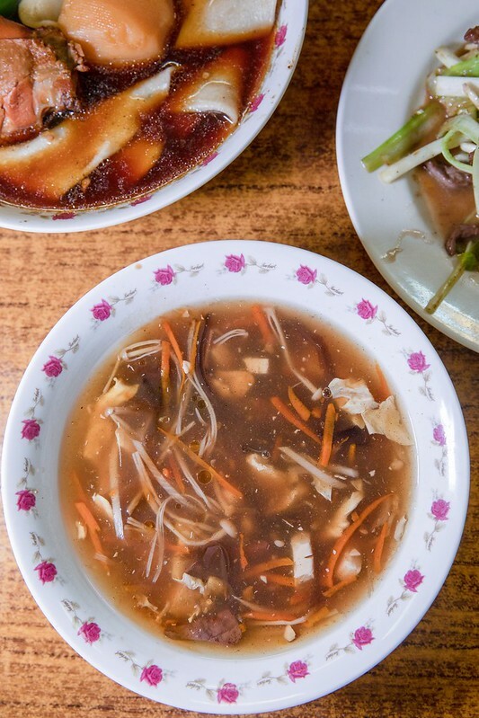 紅燒雞肉麵,印象中北部很少見?吃起來像是帶皮的滷雞腿,就不知是不是我們運氣好撈到雞腿的部位...。皮滑肉嫩,而且入味,雞肉卻不會過於柴,這點我蠻喜歡的,紅燒湯頭和北部紅燒牛肉麵有一點不一樣;如果5、6年級應該記得,以前牛肉麵是有分「牛肉麵」和「牛肉湯麵」,前者除了有牛肉塊外,還會淋上一兩匙燉牛肉的湯汁,而比較便宜的牛肉湯麵,那湯只是用醬油紅燒過熬出來的,和牛肉沒半毛關系;這湯差不多就那味,只是鹹味上應該也有略為調降。