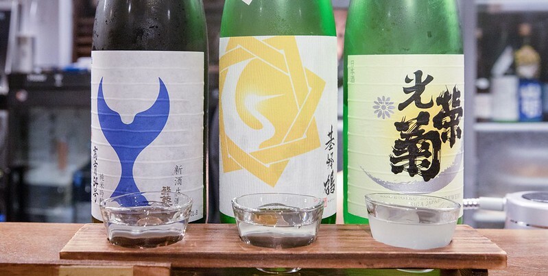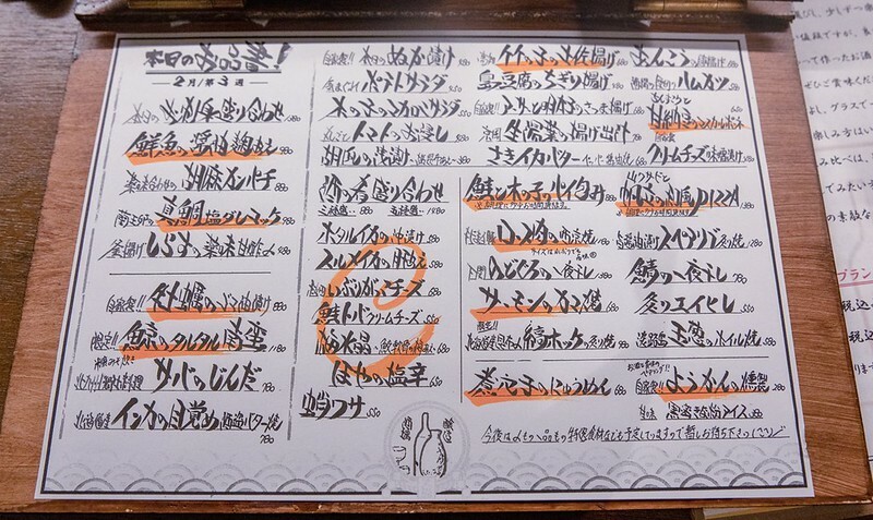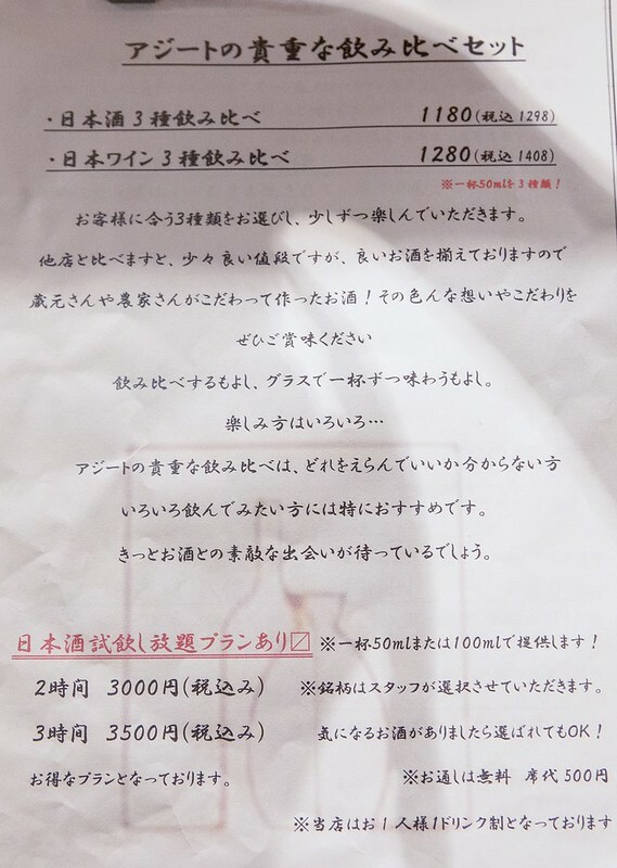 酒基本上可以請店裡的清酒唎酒師,不知道要喝什麼的也可以直接點三杯的套餐(也有紅酒三杯套餐),也可以豪爽點日本酒喝到飽(2小時3000日幣、3小時3500日幣),お通し(小菜)還免費(500日幣)。