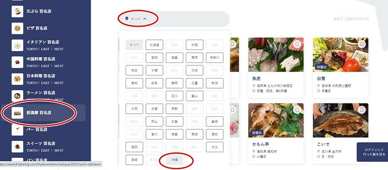 進入「日本tabelog百大餐廳」網頁後,左側的長條可以發現tabelog把日本美食大約分為29類,咱們就以「居酒屋」為例,點選「ステーキや鉄板焼き」便會跳到這一類的專屬頁面,接著紅色小圈的「すべて」(全部),就可以小範圍的選擇日本47個都道府縣,以利於尋找你所在周邊的百大名店」。ps:縣名後面的第二個「すべて」,可以更細分縣市的行政區塊,如沖繩的「石垣、那霸、名護」等。