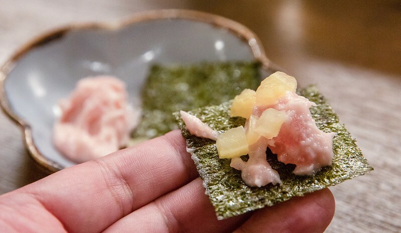 海苔捲鮪魚泥算是常見的吃法,但配上醃漬的水果倒是比較不多見,本來以為是鳳梨罐頭的切丁,但嚐了一下感覺像是水梨之類的,甜甜的也補足了咀嚼端的水份。