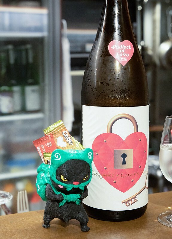 尾瀨雪融 Padlock of Love 愛情鎖 純米大吟釀,隔壁一對情侶點的清酒,我看瓶身酒標很特別,借來拍張照,結果老闆拿了一個露鳥的小偷玩偶給我..要我一起拍...。
