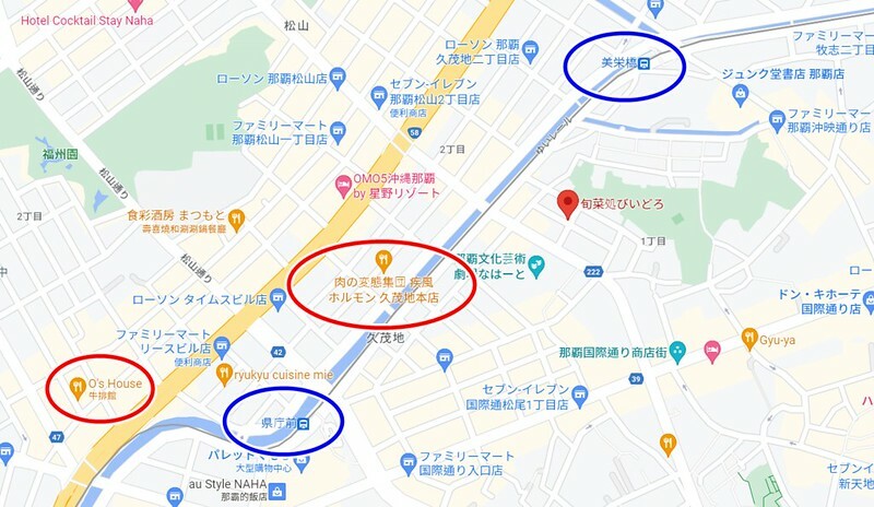 回題來聊「旬菜処びいどろ」,同樣位於縣廳前和美榮橋間,「肉の変態集団疾風ホルモン久茂地本店」(燒肉)、「O's House」(牛排)、「メキシコ」(南美料理)、「お食事処みかど」(定食)、「燕鄉房」(中華料理)也都在這兩站周邊。再說一次,想了解沖繩美食,請立馬離開國際通....。