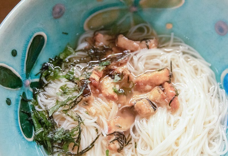穴子魚冷麵據說是料理長最愛的下酒料理,尤其是喝到復餓的下半場,麵條很細有一點像奈良的素麵,也有一點像我們的麵線,冰冰涼涼有一點冰見烏龍麵的fu,穴子略炙過香氣微微泡進湯裡,搭配海苔絲還有一點點像香菜、九層搭的沖繩野菜,爽口到越吃越餓,好吃得亂七八糟!!!