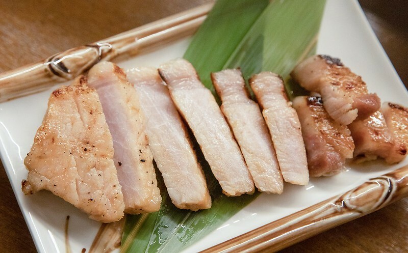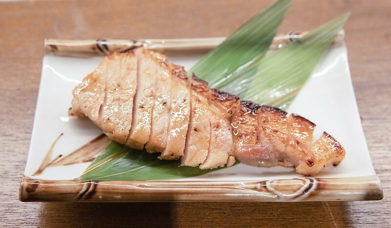 我記得這是當年限定的「阿古豬西京燒」,一般來說常吃的西京燒都是魚類,肉類就算有也沒吃過沖繩名柄豬「阿古豬」的西京燒。嚐了一口心中暗叫好吃,個人覺得西京燒的魚通常有油質的比較好吃,比方說鱈魚或是鮭魚(肚),同樣的道理阿古豬也算是比較有油質的豬肉,加上這裡的西京燒醬汁比較沒那麼厚重,沒那麼甜非常適合,尤其是那微微烤過的香甜和油甜焦香,好吃得亂七八糟,口感端因為用的是阿古豬的豬頸肉,那討喜的微脆同樣很是迷人。