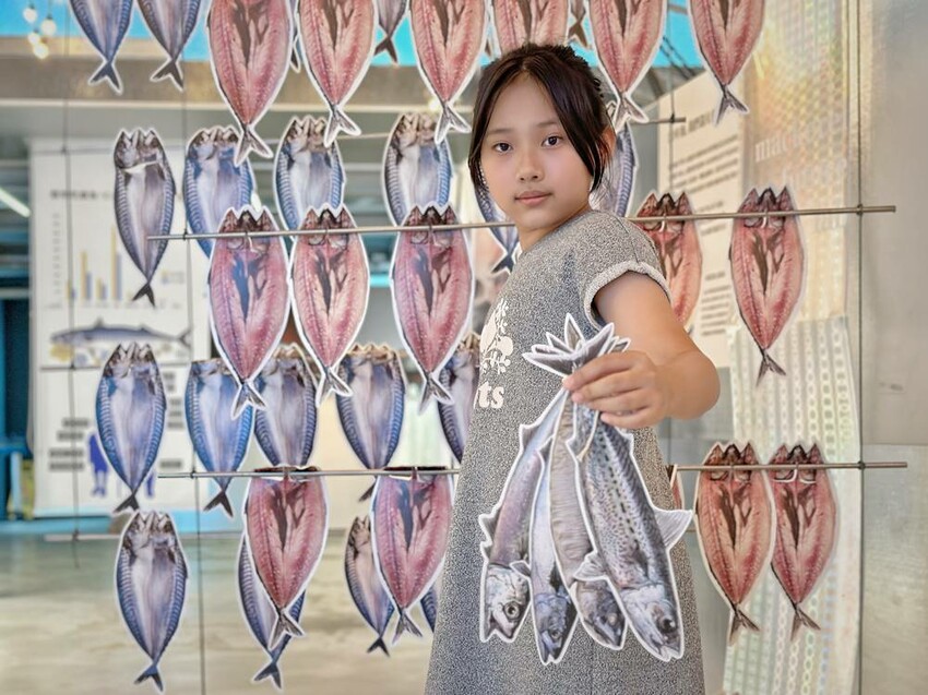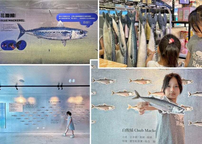 一樓也有設置一區像是我們在魚市裡見到的鯖魚補穫模樣,在塑膠籃裡(箱)內可有不少鯖魚,當然也還能知道好吃的一夜干是如何製作。且還能把剛剛拿取的鯖魚說明卡,綁一綁帶回家作紀念,也說真的我們一家人在這綁魚就花了不少時間,蔬果姐妹一整個就玩的超開心。