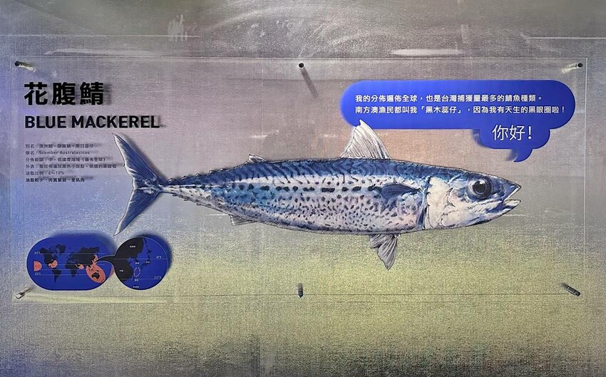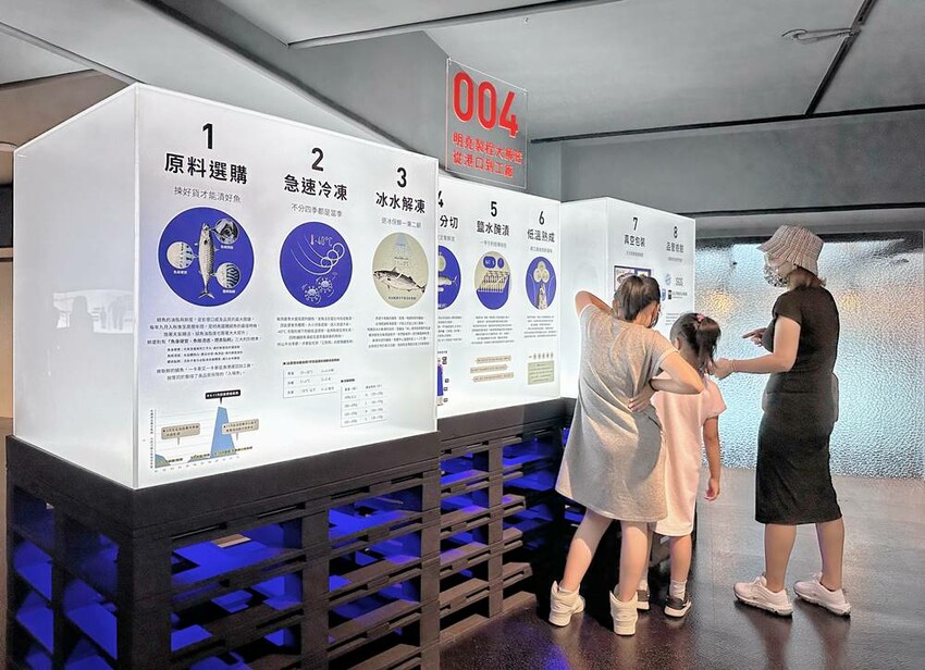 來到二樓順著指標路線參觀,可以了解不少鯖魚的相關知識、各國不同的魚種、定置漁網介紹等,也透過介紹讓我們能知道不少有關食品加工也能保留鯖魚的價值、營養等,也透過圖片以及文字的解說,讓我們瞭解更多從原料的選購、冷凍、剖殺分割、鹽水醃漬、低溫熟成、真空包裝等相關製程就成了冷凍裡的鯖魚。