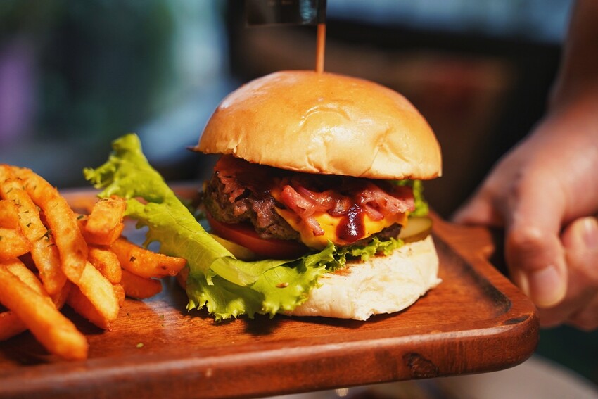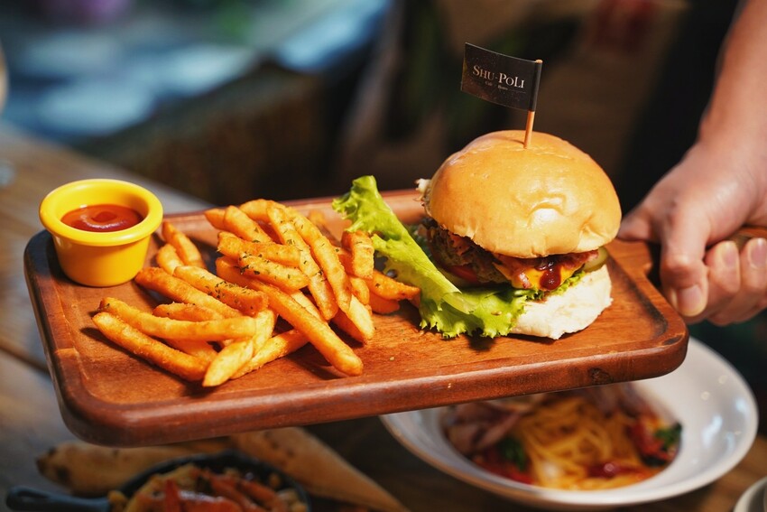 手打漢堡排推薦飽滿多汁的「焦糖洋蔥BBQ培根堡」,燒烤風味的BBQ醬融化了起司、香甜的焦糖洋蔥以及香脆的培根片,再加入新鮮的番茄和酸黃瓜,吃起來更是爽脆的清爽口感,另附香脆薯條,吃起來更滿足。