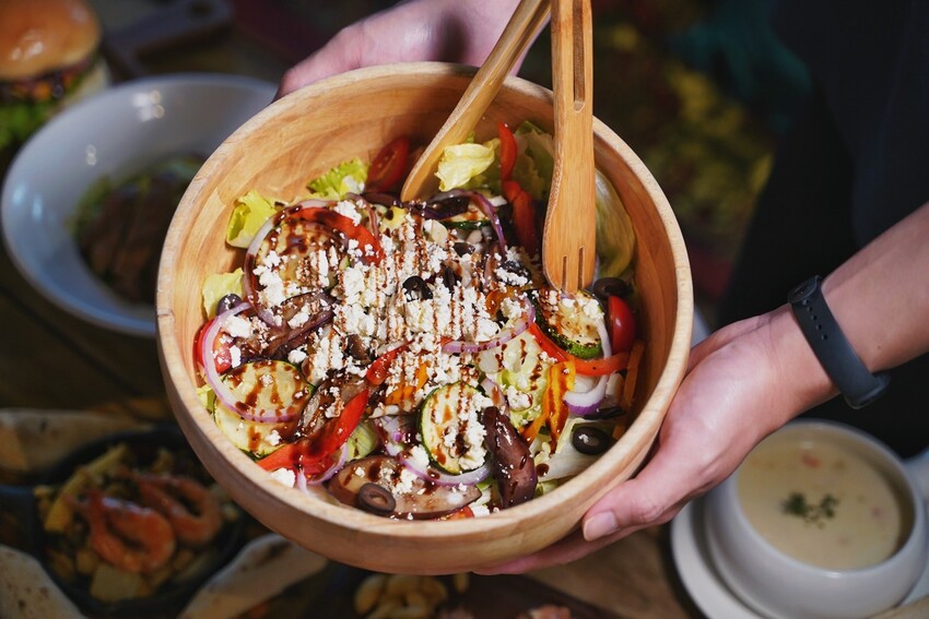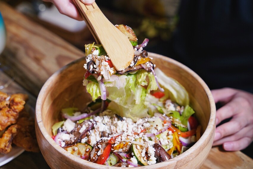 「費達蘑菇橄欖沙拉」以美生菜、洋蔥、節瓜、茄子、黑橄欖、甜椒及蘑菇等多種食材入菜,上頭還撒滿了美味的費達起司,最後再淋上義大利老醋,醬料有四種選擇,當天選了清爽的柳橙油醋醬來試試,使每一口都能品味到不同的香氣。這道沙拉食材真的非常豐富,完全能讓人感受到食材的真實美味,三五好友來用餐必點!