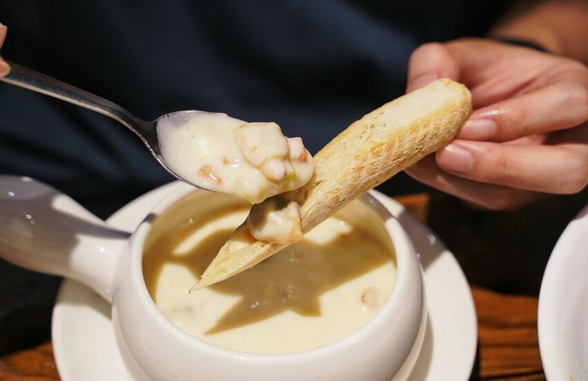 套餐升級的「今日濃湯」,當天喝到的是用料超實在的蛤蠣濃湯,真的每一口都是料,還能搭配一旁附的手工麵包,真的好滿足。