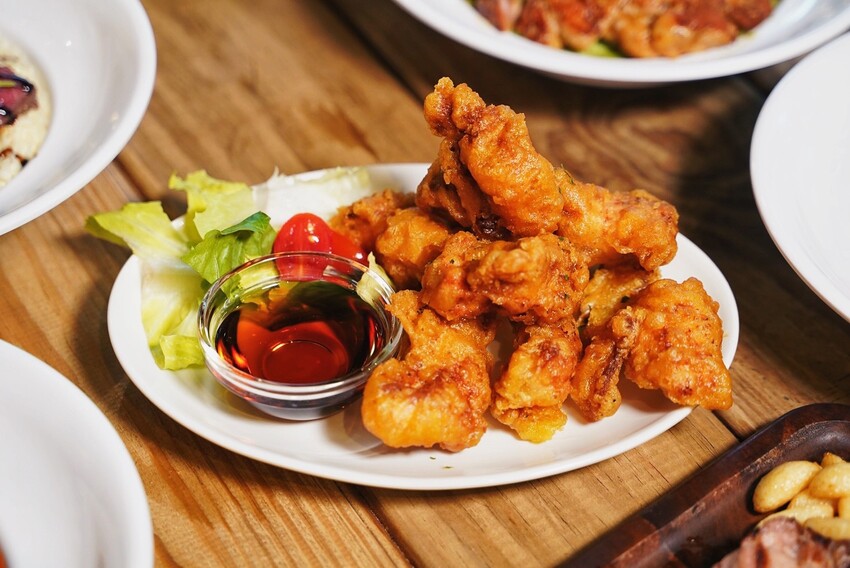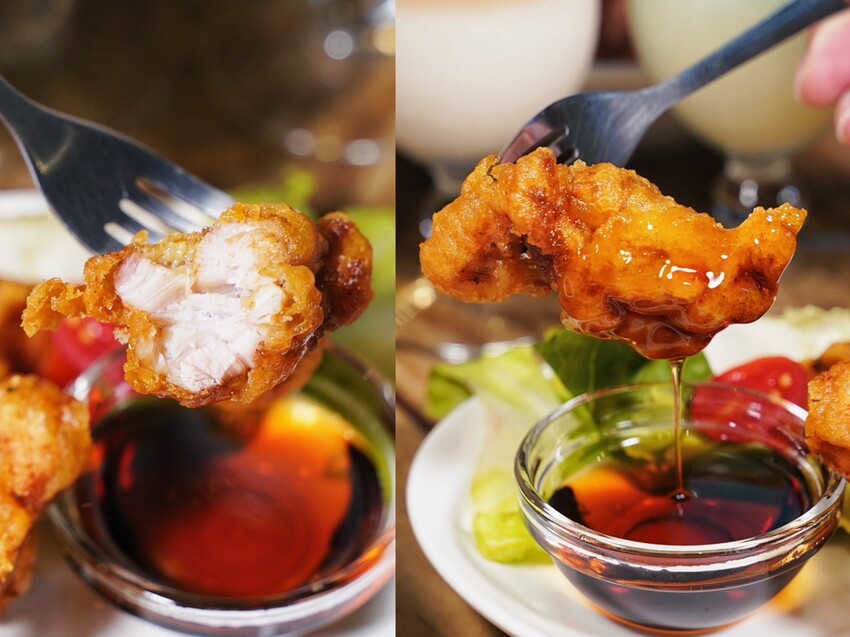 「南方肯瓊炸雞佐楓糖」也是必點!使用肯瓊香料醃漬後下鍋油炸至金黃,口感是皮脆肉嫩,沾點楓糖享用,更是別有一番風味,會讓人上癮的滋味。