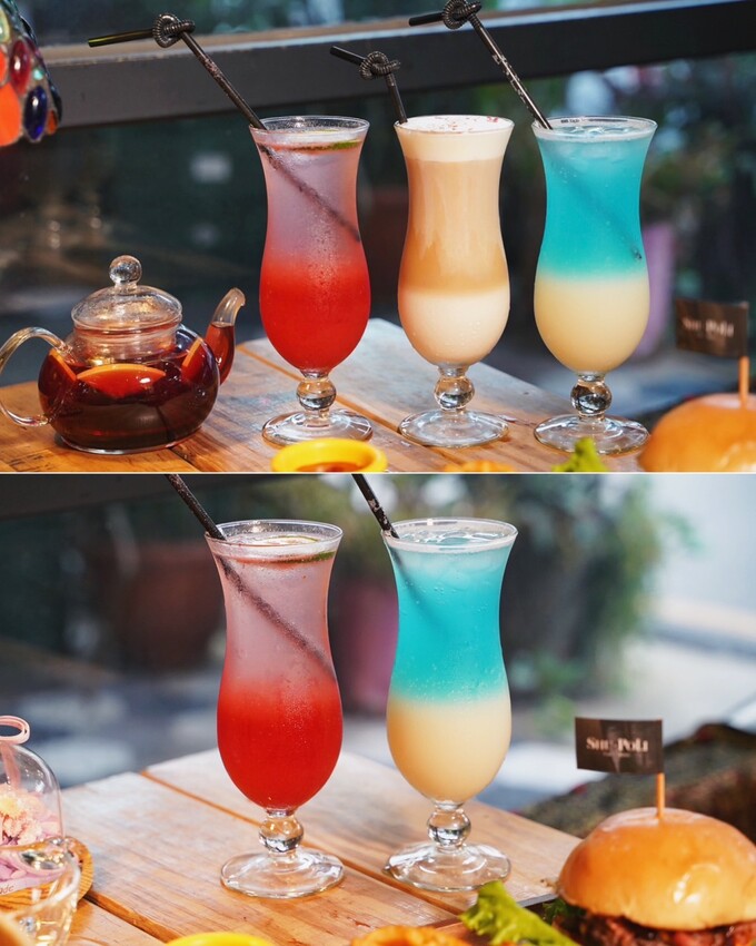 「晴空蘇打」底層是可爾必思,上層是藍甘菊氣泡水,很日系風味的飲料。「覆盆子玫瑰氣泡飲」一入口有檸檬、莓果的酸甜感,以及淡淡的玫瑰味,喝起來很清爽。熱茶推薦「木槿野莓果茶」,加入新鮮蘋果或香吉士,酸酸甜甜相當解膩。「玫瑰拿鐵」撒上可食用花瓣,入口有玫瑰花香以及甜甜的奶香。