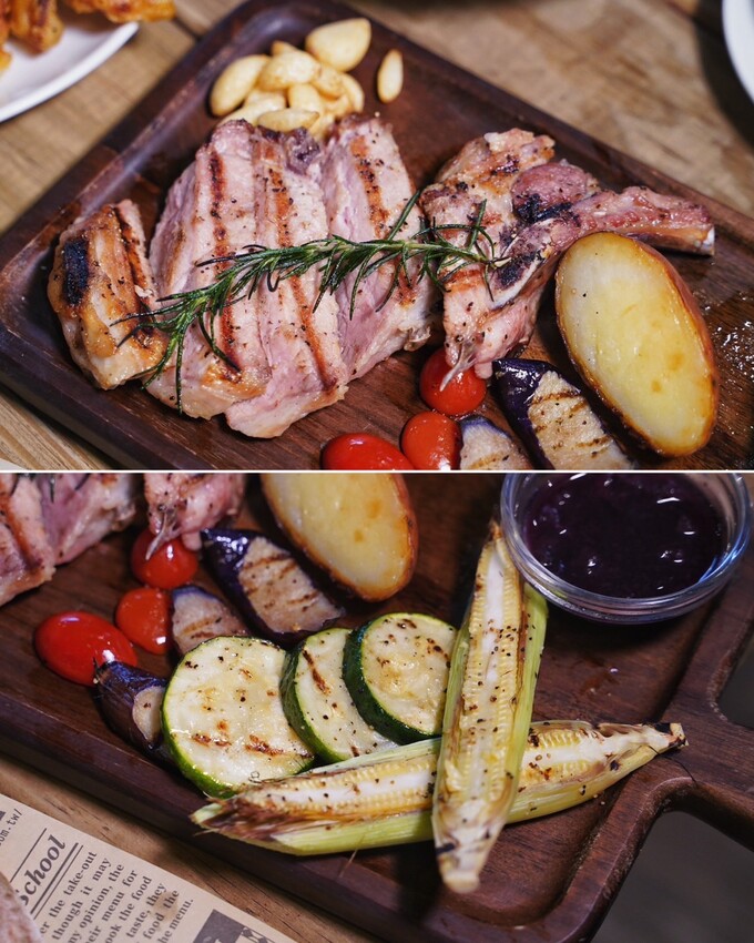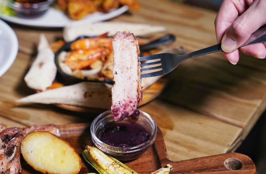 「炭烤13oz葛瑪蘭豬排」選用宜蘭優質黑豬肉,經過炭烤後,口感吃起來是非常軟嫩且完全沒有腥味,旁邊還有烤時蔬及莓果醬可以搭配,能增添整體口感及香氣的層次。
