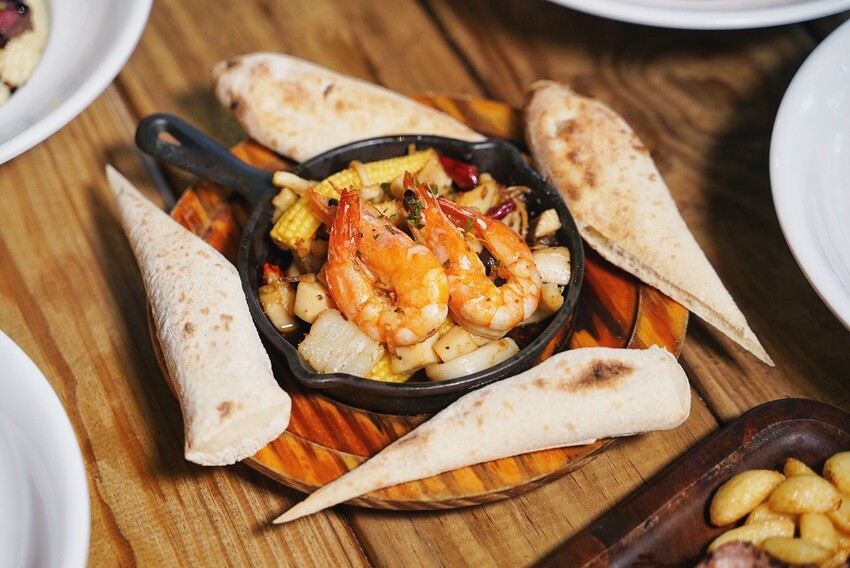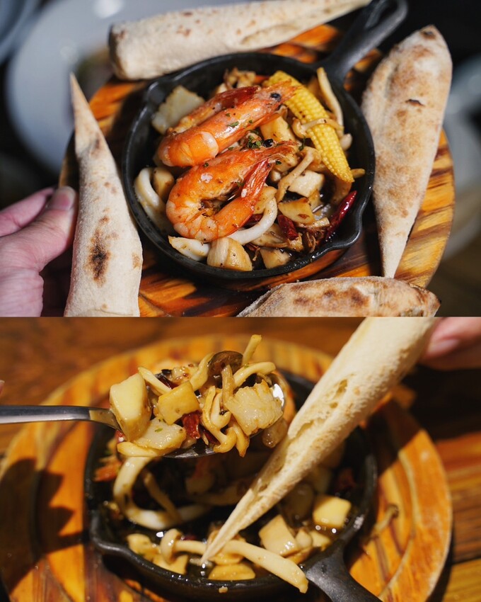 前菜「鐵板油封海鮮」上桌時鐵板滋滋作響,看得到花枝、干貝、菇類,另附手工麵包可以搭配,吃不夠能免費續一次,味道是香辣且充滿海鮮的香氣,挺重口味的開胃菜,推薦!