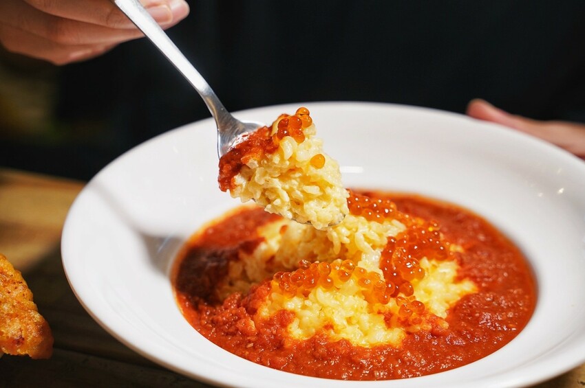 看起來超誘人的「海膽蝦膏鮭魚卵燉飯」,每一口飯粒都吸飽了海膽醬的香氣,周圍還淋上濃稠的蝦膏蕃茄紅醬,上頭再鋪上滿滿的鮭魚卵,營造出豐富又濃郁的海味,每一口都是高貴不貴的享受。