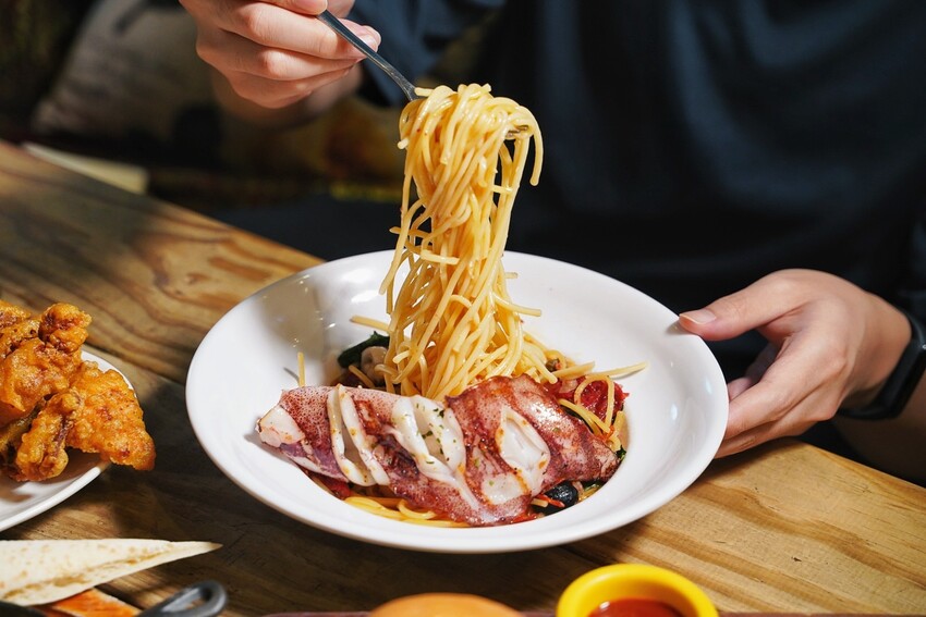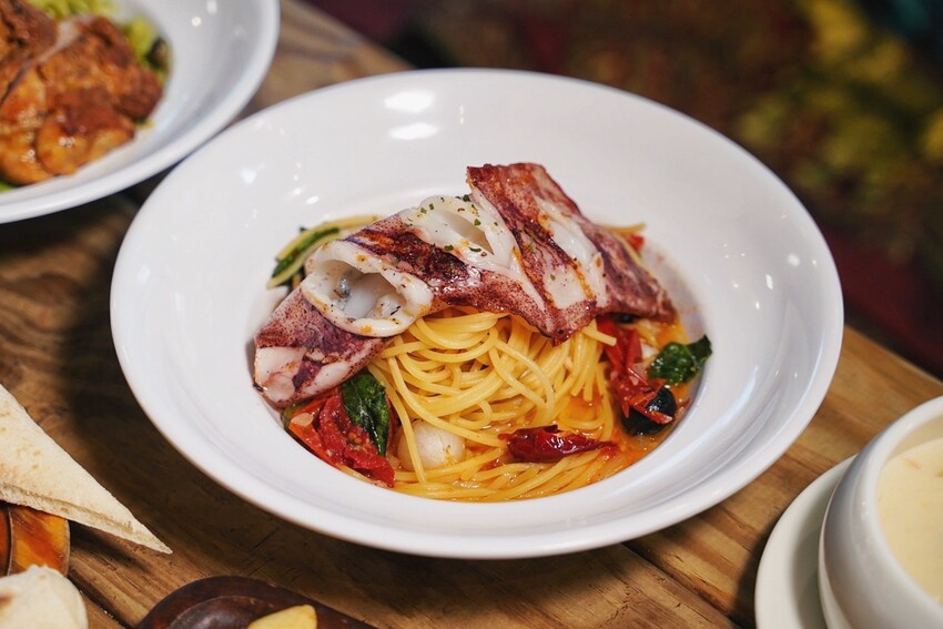 重口味者首選推薦這道「辣味煙花女中捲義大利麵」,加入很多醃漬小洋蔥、黑橄欖、乾辣椒 酸豆、蒜末、油封蕃茄等等食材,酸辣帶勁的調味完全吸附在義大利麵上,真的非常涮嘴好吃,上頭還有一隻現烤大隻中捲,肉質鮮甜彈牙又好吃。