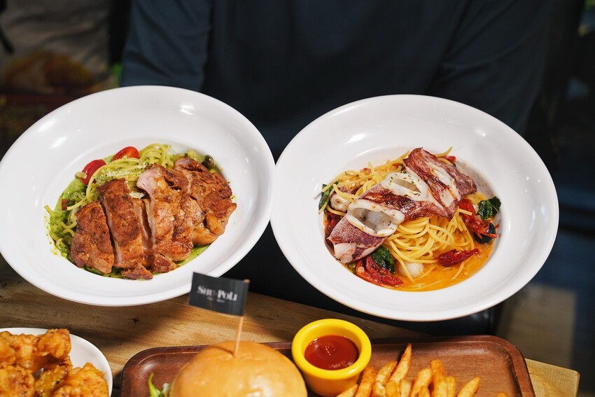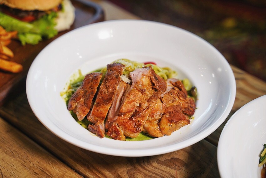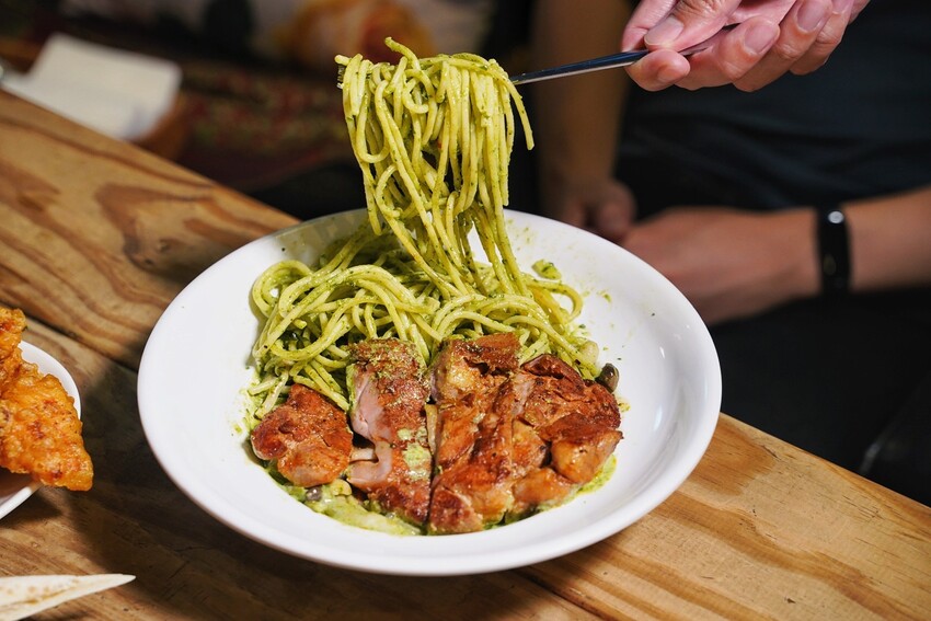 「青醬野菇炭烤雞腿義大利麵」是使用醃漬後的雞腿排去搭配肯瓊香料來調味,油煎至外皮金黃酥脆,口感鮮嫩多汁,翠綠的義大利麵有濃厚的青醬香氣,搭配甜椒、多種菇類更增添整體口感的豐富度。